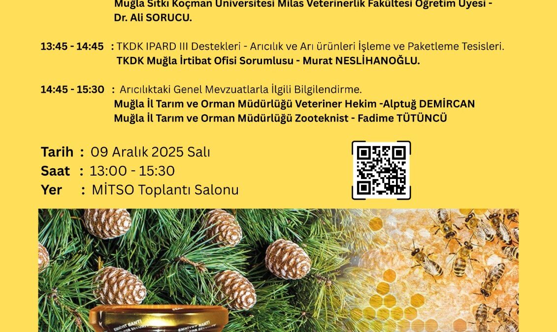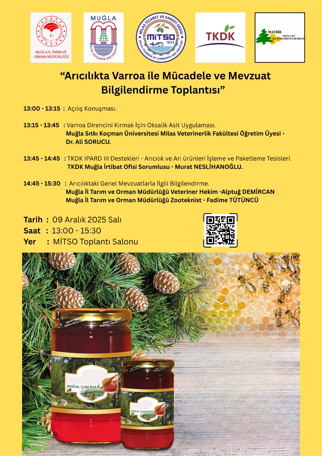 09.12.2025 Salı günü saat 13:00’te Milas Ticaret ve Sanayi Odası Toplantı Salonu’nda Birliğimiz, Muğla İl Tarım ve Orman Müdürlüğü, Muğla Sıtkı Koçman Üniversitesi Veterinerlik Fakültesi Dekanlığı ve TKDK organizasyonunda Arıcılarımıza “Arıcılıkta Varroa ile Mücadele, Mevzuat ve TKDK Desteklemeleri” konulu bilgilendirme toplantısı gerçekleştirilecektir.